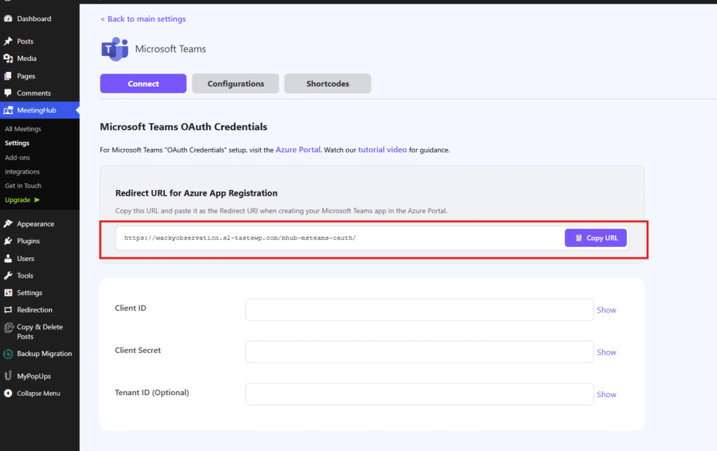 This guide provides a professional, step-by-step walkthrough for integrating Microsoft Teams with MeetingHub. By following these instructions, you will be able to schedule and manage Teams meetings directly from your WordPress dashboard.