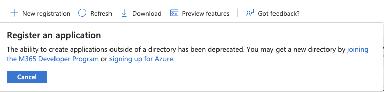 If you see this, That means you need to join to Developer program, or sign up to Azure so you can use Microsoft Teams API. If you don’t have access to Developer Program we can suggest you to sign-up for Azure as it has their own pay as you go policy. When you have proper Azure account, go to App Registrations and click new registration button.