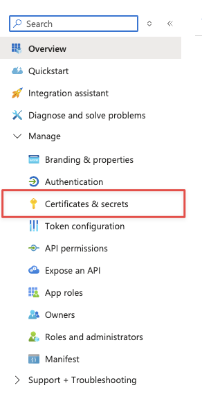 1. In the left sidebar of your App Registration, click Certificates & secrets.