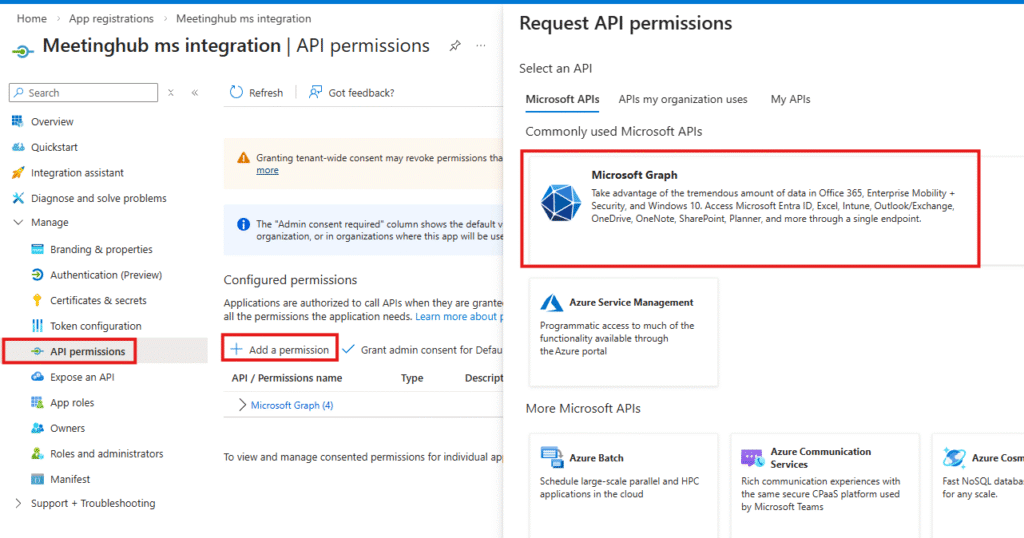 1. Go to API permissions in the left sidebar and click + Add a permission.